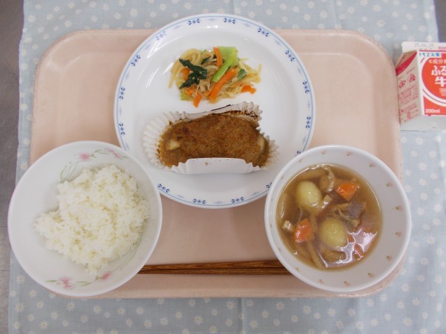 今日の給食は、有機米、有機野菜(にんじん、じゃがいも)、東京都産の小松菜を使った献立にしました。