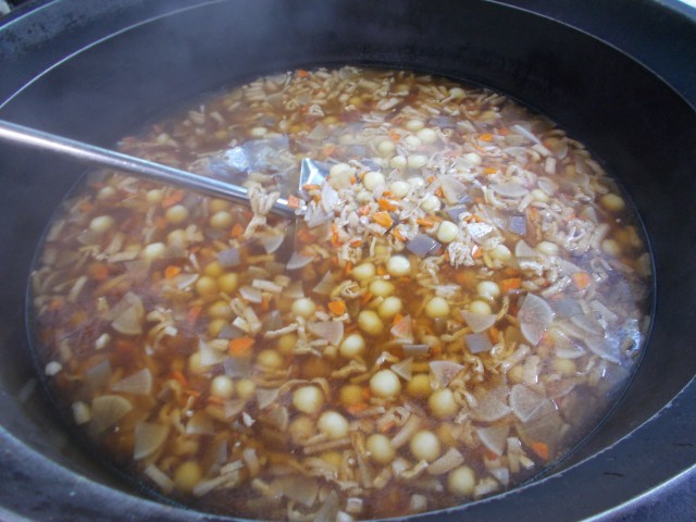 有機野菜のにんじんは岡山県産、じゃがいもは宮崎県産です。いもだんご汁は、じゃがいもを一度ゆでてからつぶし、片栗粉を加えてよく練ってだんごを作ります。ゆでるともちっとした食感になり、そのままのじゃがいもとはひと味違った味わいになります。