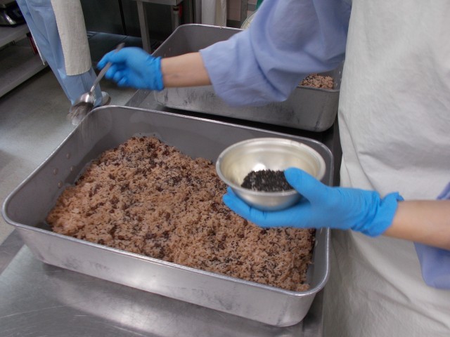 今日は奥沢中学校の開校記念日でした。そのため給食室ではお赤飯を炊きました(尾山台中の分は麦ごはんを提供しました)。ごはんの色や豆の形がキレイに仕上がるよう、調理員さんが丁寧に、こだわって作ってくれました。仕上げに手作りのごま塩をかけて提供しました。