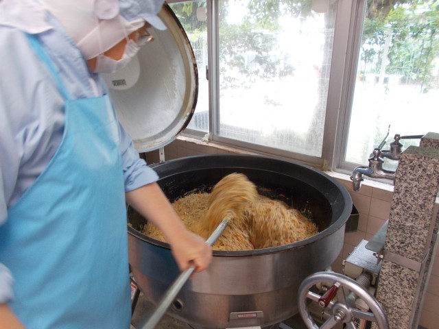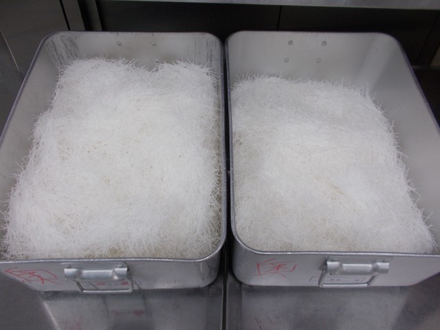 今日は、春雨たっぷりの麻婆春雨を作りました。尾山台中、奥沢中合わせて11kgの春雨を使いました(写真2枚目は奥沢中学校分の春雨です)。ピリッと辛さがあり、ごはんの進む味付けでした。ごはんはほとんど完食でしたが、麻婆春雨の量が多く、残ってしまった学級が多くありました。次回はごはんとのバランスを考え、調整して作ります。
