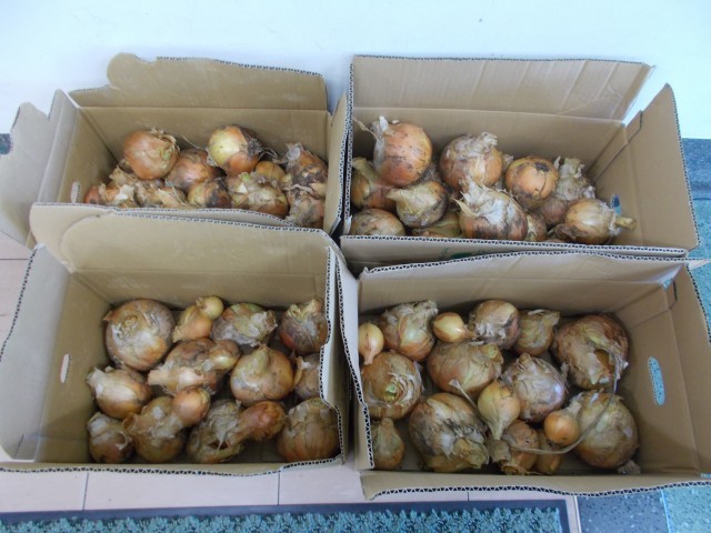 毎年保健給食委員会が11月に植えているもので、6月に収穫します。今年はなんと大豊作!ダンボール4箱分、約20kgのたまねぎが収穫できました。たくさん収穫できたため、今年は2回に分けて給食に提供します。