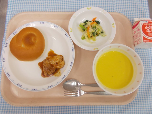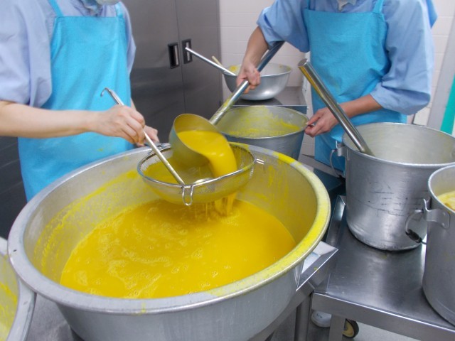 かぼちゃのポタージュスープは、かぼちゃを蒸して、皮をむいて、カットするところから始めます。なめらかな口当たりに仕上げるため、ミキサーにかけた具材をさらに手で濾していきます(写真3枚目)。給食を楽しみにしてくれている生徒のため、今日も精魂込めて丁寧に作ってくれました。一から作ったスープはお店のような本格的な味わいで、ほとんどの学級が完食でした。
