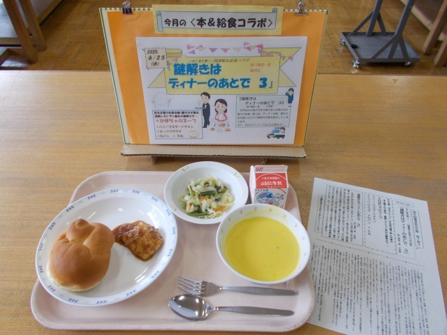 今日は【図書コラボ給食】でした。図書委員の生徒が選んだ本『謎解きはディナーのあとで』とコラボし、かぼちゃのポタージュスープを作りました。