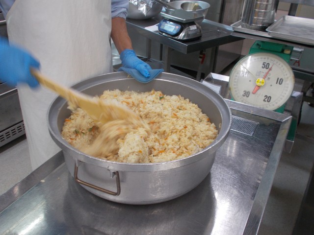 こぎつねごはんは、油揚げが入った混ぜごはんです。にんじんやこんにゃく、鶏ひき肉と一緒に油揚げを炒め、しょうゆやさとうで甘めに味付けをしています。出来上がった具をごはんに混ぜて完成です。