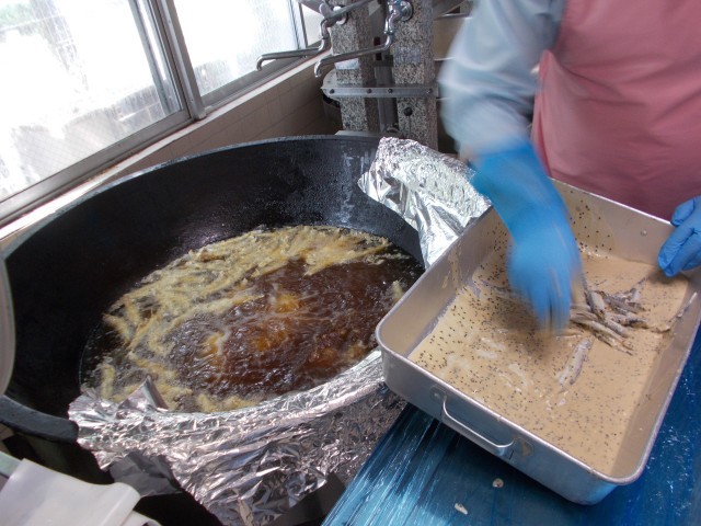 ししゃもの南部揚げは、衣に黒ごまを混ぜています。ししゃも一本一本丁寧に粉付けし、衣をつけて揚げていきます。「焼く」と残りがちなししゃもも、「揚げる」とよく食べてくれます。