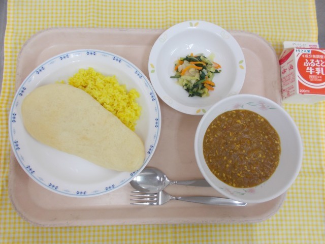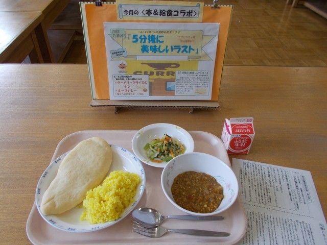 今日は図書コラボ給食です。図書委員会の生徒が選んだ本「5分後に美味しいラスト」より、ターメリックライスとナン、キーマカレーを作りました。給食でも、ナンとライス、キーマカレーのバランスを見ながら上手に食べている子が多くいました。パン屋さんから届いたナンは、給食室でもう一度焼いてから提供しています。