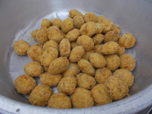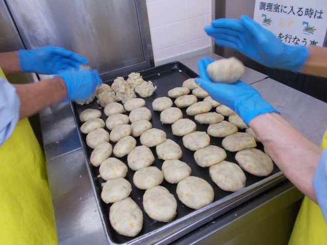 今日は自校給食最後のコロッケということもあり、調理員さんが精魂込めて作ってくれました。じゃがいもをゆでるところからこだわり、なめらかになるようマッシュしていきます。約600個のコロッケをひとつひとつ丁寧に成形し、パン粉をつけて油で揚げていきます。