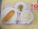 今日の献立は、 ・牛乳 ・ビーンズドッグ ・クラムチャウダー ・何でも千切りサ...