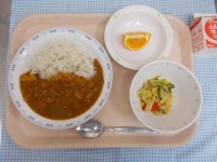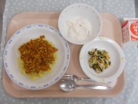 今日の献立は、・牛乳 ・チリビーンズライス・なんでも千切りサラダ ・フルーツヨー...