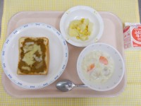 今日の献立は、・牛乳 ・ドライカレートースト・キャベツのクリーム煮 ・コーンポテ...