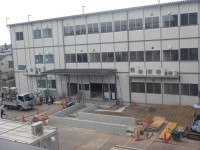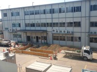 仮設校舎の昇降口前でも連絡通路の工事が始まっています。