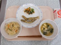 今日の献立は、・牛乳 ・こぎつねごはん ・ししゃもの南部揚げ・こまつなのおひたし...