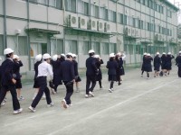 地震を想定した避難訓練を行いました。前回に続いて2回目となる、ヘルメットをかぶっ...