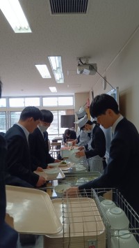 明日は、卒業式。3年生、最後の給食。本日の献立は、卒業お祝い献立。鯛のおこわ、鰤の香味揚げ、野菜のからしあえ、お祝いすまし汁。これからも食べることを楽しんで、健康な体を作ってください。