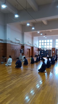 I組、体育、空手の授業の様子。「礼に始まり礼に終わる」正座をし、精神統一。新聞紙...