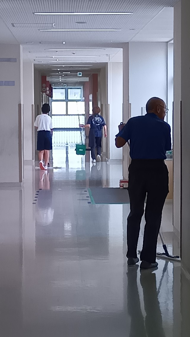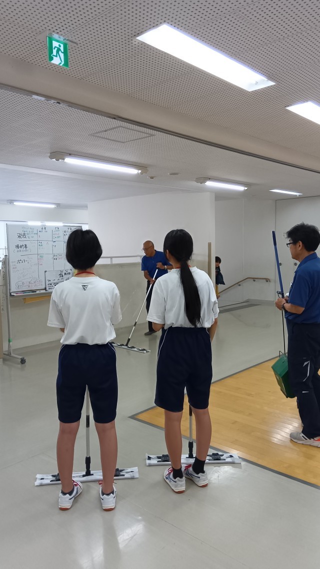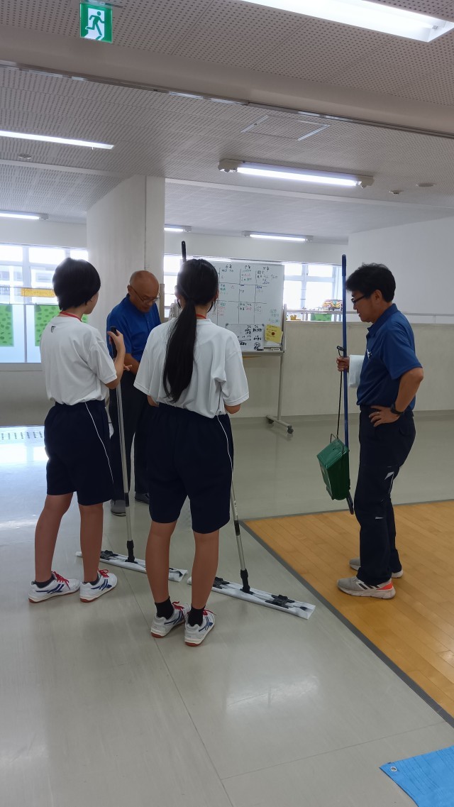9月10日、2年生職場体験2日目。㈱ソシオ様に体験の生徒達。効率よく、丁寧な掃除の方法を習いながら、頑張ってました。
