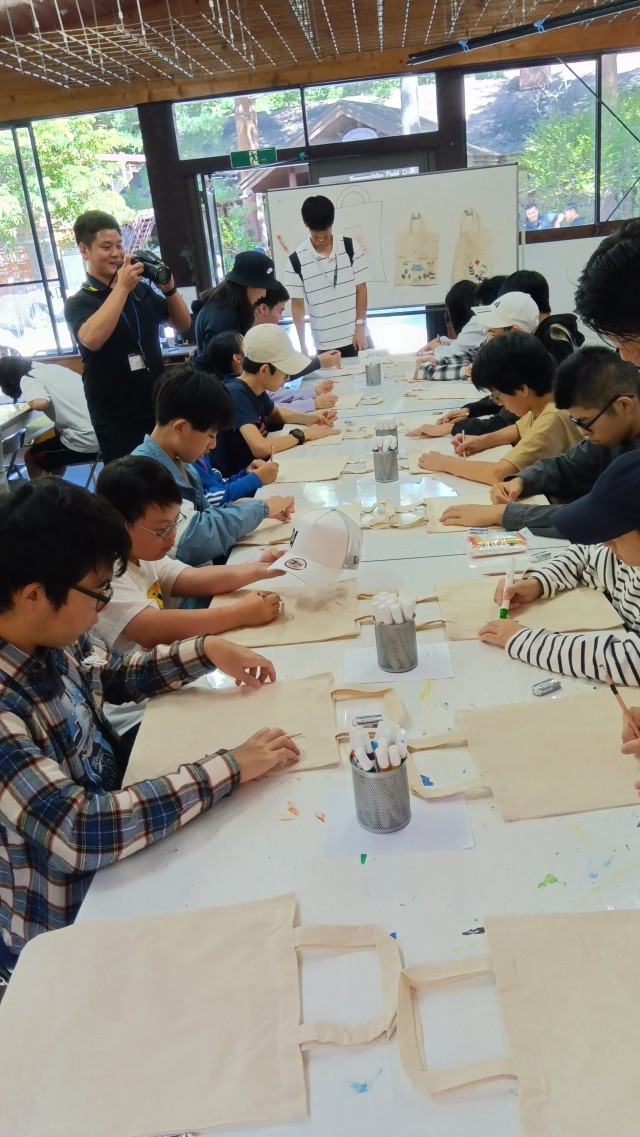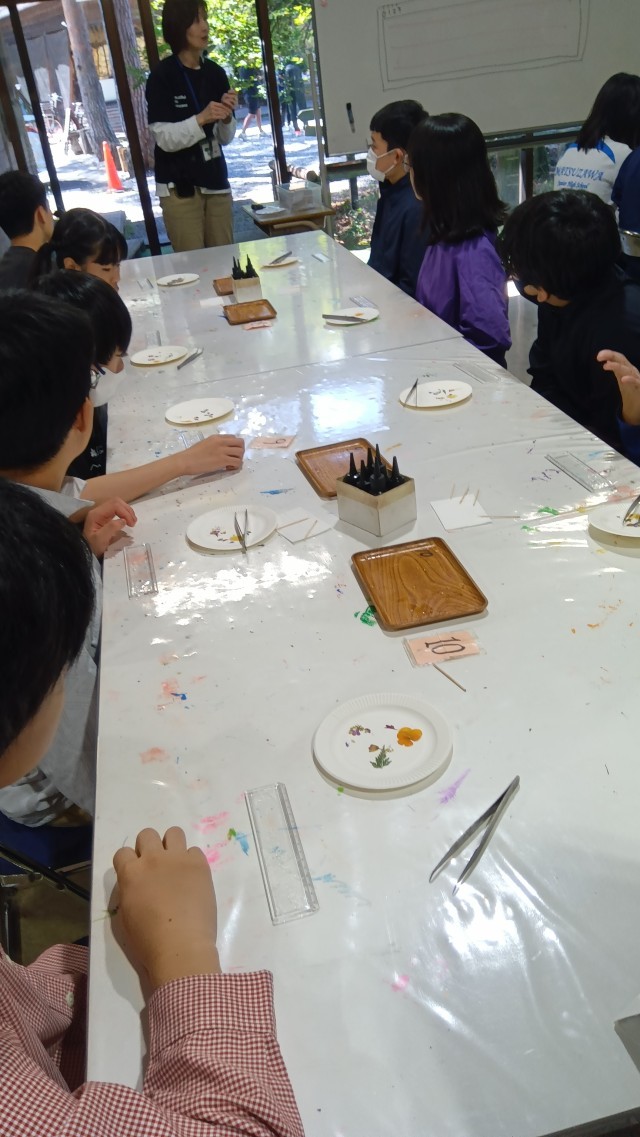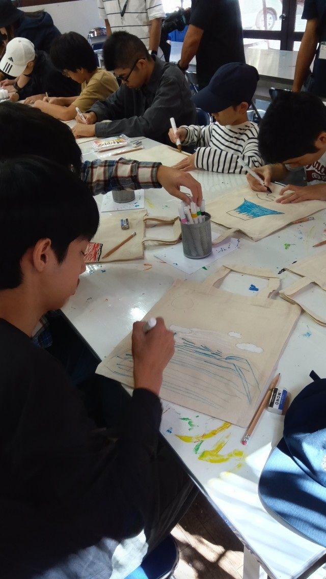 他校とも合流し、現在、トートバッグ製作、定規製作の2班に分かれて体験を行っています。