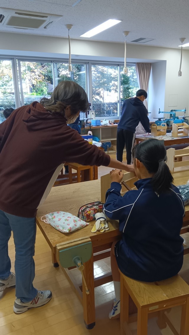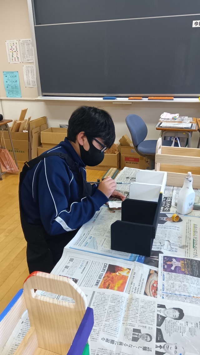 1校時、I組技術。棚、完成間近です。完成した生徒は、思い思いの色を塗っています。