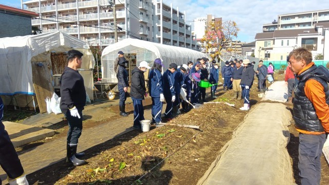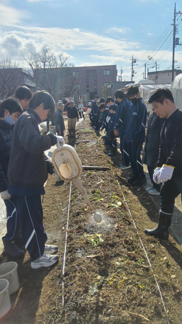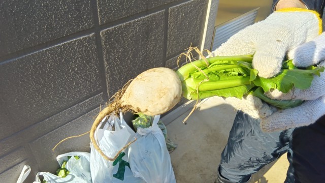 校外の農園に出かけ、カブを収穫しました。生徒全員が持ち帰れるくらいたくさん育っていました。前回まで、間引いたり、土に枯れ草を被せたりしてきました。