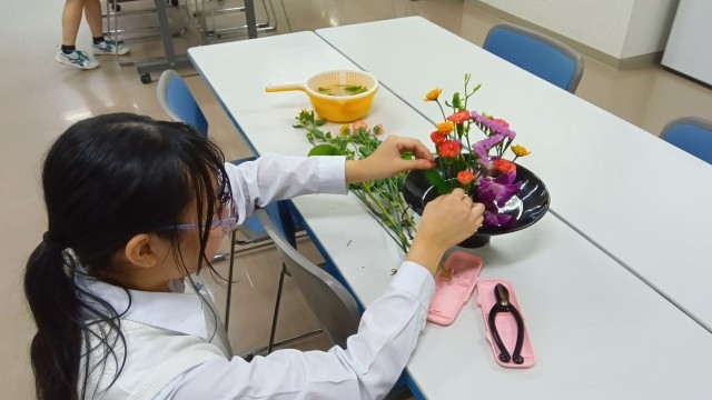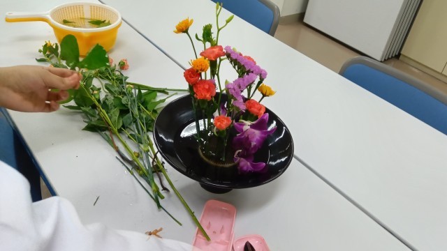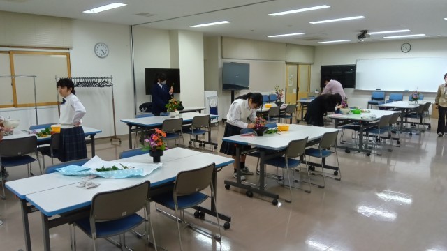 明日の卒業式に向けて、在校生が心を込めて準備をしています。こちらの写真は、STEP生花の生徒たちが来賓控室用に花を生けているところです。