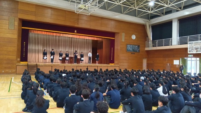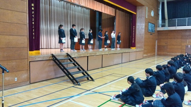 生徒が主体となって運営する生徒会朝会ですが、今回は生徒会役員の司会の下、役員からの言葉、前期の委員会の委員長の任命式を行いました。