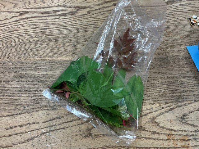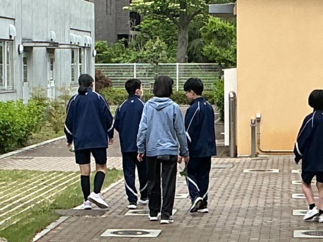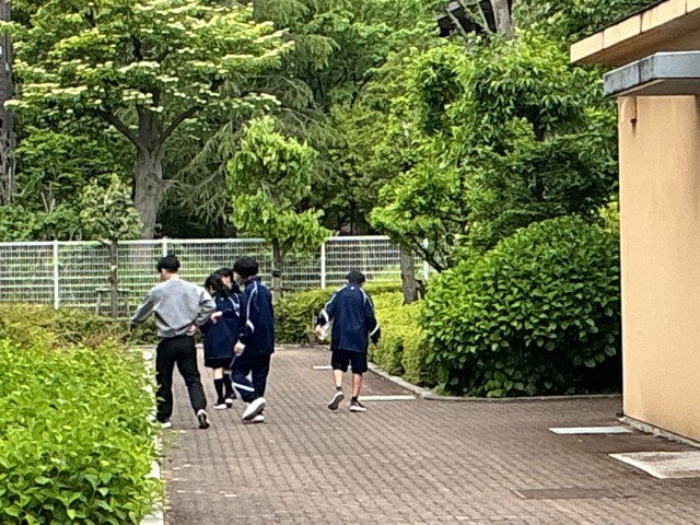 技術の授業では、押し花で装飾した下敷を作成しています。今日は、班ごとに校舎周りを巡って、押し花に使う、花やきれいな葉を集めました。