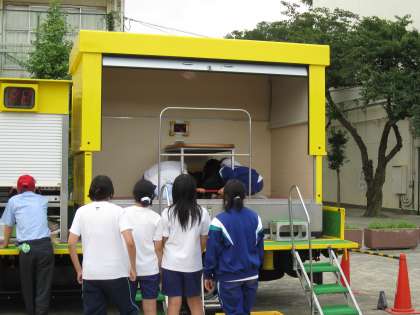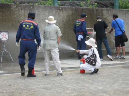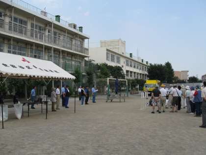 7月16日(木)午後、全校生徒と地域の方達が一緒になって防災訓練を行いました。今年は、地域の方のたくさんの参加があり、猛暑の中、さまざまな訓練や体験をしました。起震車に乗ったり、消火器で火を消したり、AEDや煙の中を歩く体験もしました。