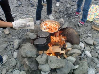 事前に購入した食材を持ち合わせて、カレーライスや豚汁をつくりました。食後には河原にある石を採取し、粒の大きさの違いなどを観察する石調べを行いました。79名全員が、無事に校外学習を終えることができました。