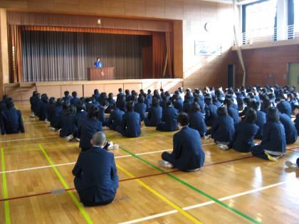 ねらいは「目標に向かって心をしっかりもって、努力し続けることができるようにする」です。生活指導主任の久保先生から、Jリーグの選手のエピソードを交えながら、生徒に分かりやすく、「我慢して継続することの大切さ」の話をしました。