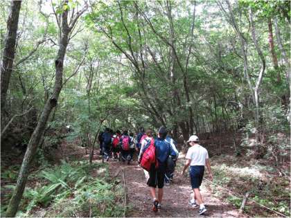 初日は、林の中のハイキングです。コウモリ穴も見学しました(写真1枚目)