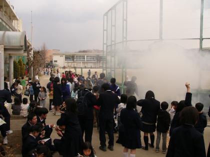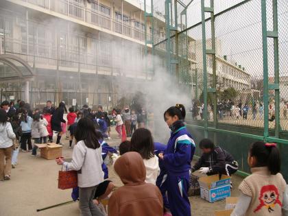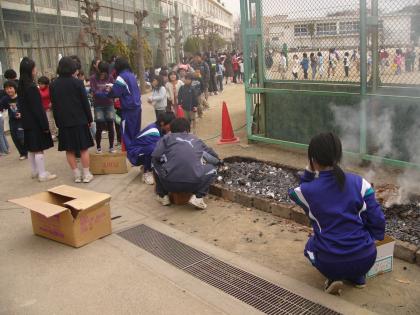 3月7日(金)生徒会主催『焼きいも大会』が行われました。秋に落ち葉掃きで集めたものを焚き火に利用しました。用意した薩摩芋は300個。芦花小学校との交流で、生徒会役員が整列の案内をしたり芋を手渡しします。中学生は焼き芋券が一人一枚配られました。他に、PTAから豚汁の炊き出しがありました。暖かいおいしい豚汁と焼き芋を、小学生と中学生が睦ましく、おいしそうに食べている光景がみられました。