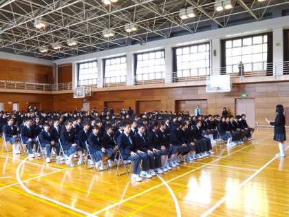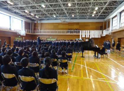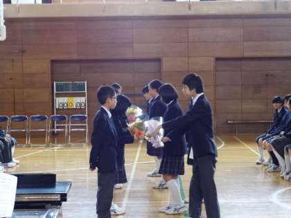 1年生へ3年生からの歓迎の言葉と花束が贈呈、2・3年生合同による合唱が歌われました。