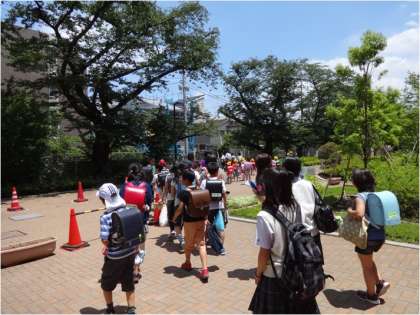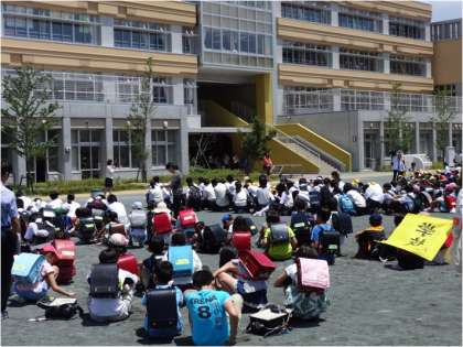訓練では、中学生と小学生が地区ごとに班をつくって校庭に待機し、全校で集合の後、小中一緒の地区班で下校しました。