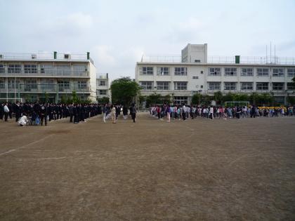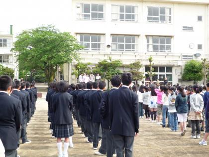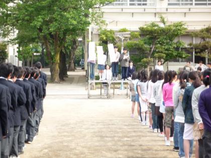 芦花中学校では、昨年に引き続き、同じ敷地内にある利点を生かして、隣接する芦花小学校との合同の研究を行っています。その一貫として合同朝会を28日(月)に行いました。お互い向き合って挨拶したり、生徒会と児童会が今年度の内容を発表しあいました。