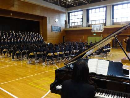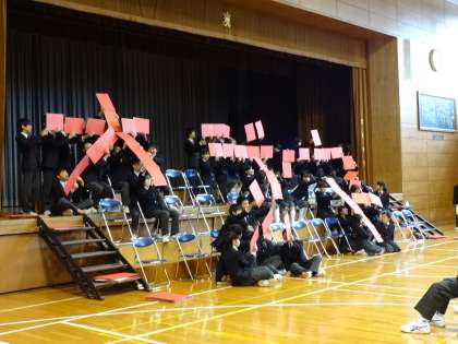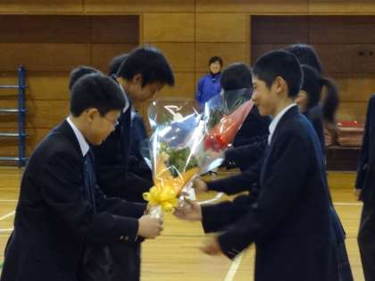2年生からは合唱と言葉、3年生からは人文字(手に持ったプレートで「ROKA」や「一年生オメデトウ」などを表しました)と合唱を新入生へ送りました。また、各委員会の紹介や花束が贈呈されました。