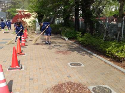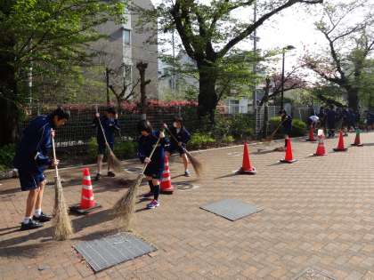 4月17日の朝、3年生の整美委員とボランティアが集まって桜のがく掃きが行われました。