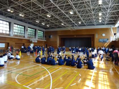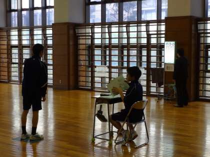 学級委員が先導して保健委員と体育委員が記録をとりました。順番に従いつつも、空いている測定場所へ臨機応変に移動し、スムーズに測定が進みました。