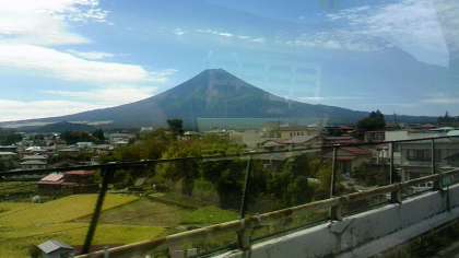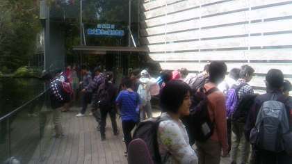 最初の目的地、富士湧水の里水族館に到着しました。富士山が頂上まできれいに見えます。水族館を見学した後、昼食です。