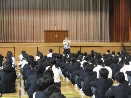 音楽の先生である内藤先生は、今回の講話で、ある合唱曲にまつわるお話をされました。その曲のタイトルは『群青 平成24年度小高中卒業生に捧ぐ』です。実はこの曲の作者は、福島県相馬市立小高中学校の卒業生なのです。彼らが1年生のとき、東日本大震災が起こり、福島第一原発事故により、相馬市は警戒区域に指定されてしまいました。それにより、当時の小高中の1年生の生徒は全国に散り散りに。106名いた生徒は新学期には6名になっていました。