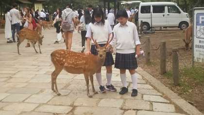 本日最後の見学場所である東大寺、奈良公園に到着し、ガイドさんの説明を聞きながら、東大寺を見学しました。大仏殿の柱の穴くぐり抜けにチャレンジしたり、鹿に鹿せんべいをあげたりしました。
