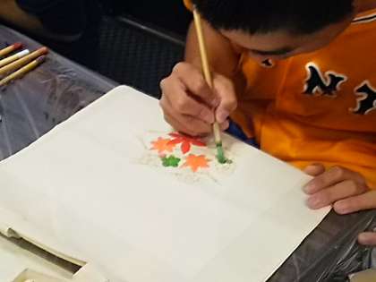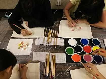 各班とも、ほぼ予定通りの班行動を終え夕方には2日目の宿に到着しました。夕食後に、エコバッグの絵付け体験にチャレンジしています。