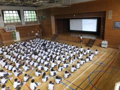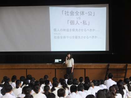 10月3日に全校朝会が行われ、人格の完成の講話が星野先生により行われました。今月のテーマは「公共心」です。