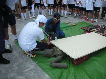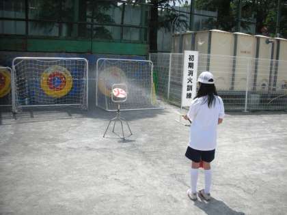 8月25日(水)の3・4校時に、防災訓練が行われました。成城消防署の方々や区の防災担当の方々が来てくださり、「救出救護訓練」、「バケツリレー」、「煙中避難訓練」、「起震車による地震体験」、「消火器での初期消火訓練」等を行いました。