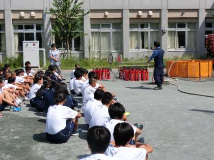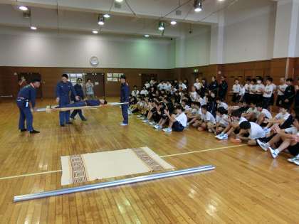 9日には芦花小学校と芦花中学校の合同で防災訓練が行われました。1年生は車いす体験とAED119番通報、2年生は担架訓練とDポンプ体験、3年生は防災についての講話がありました。