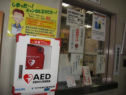 11月19日に開催された避難所運営・防災訓練で行ったAEDは、芦花中学校の玄関・受付の左側に設置されています。もしもの時には、どなたでも活用できますので、本校生徒・保護者・地域のみなさん、ぜひ覚えておいてください。