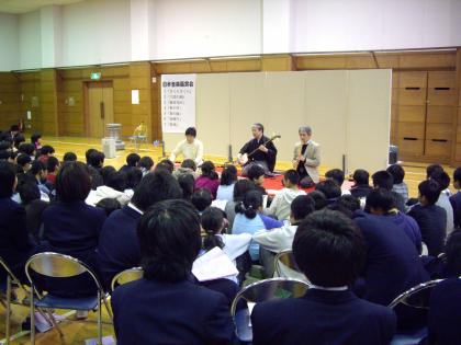 日本音楽に親しむ目的で、小学校6年生と一緒に、プロの箏曲演奏者と尺八演奏者による演奏を鑑賞しました。宮城道雄作曲の『春の海』など7曲の日本音楽を聴きました。