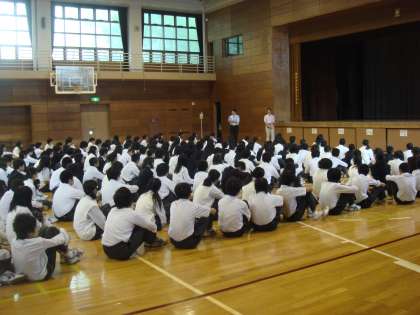 人格の完成を目指しての10月のテーマは「公共心」です。「公共心」のテーマにそっての講話を和田副校長が行いました。その内容は、ヒトだけではなく、全ての動物は、動物社会のルール従って、より良く生きようとします。もし、ルールやマナーを守ることで公共心があるならば、動物にも公共心があるのでしょうか。地球上で唯一、ヒトだけがより良く生きるために、“自らの社会のルールを造り出すことが出来る”動物です。それが他の動物とは違うところだと言われています。芦花中学校の皆さんには、さらに“人”として、高いレベルでの公共心を考えて欲しい。というお話でした。生徒の皆さんも真剣に話を聞いていました。