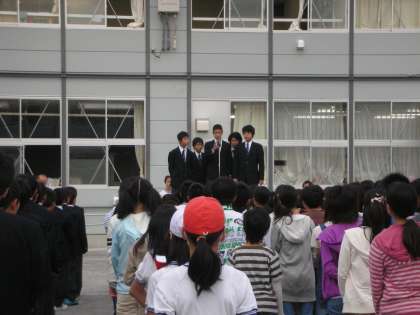 10月18日月曜日に芦花小学校と芦花中学校が合同で朝礼を行いました。小学校では代表委員が中心となり芦花小こども祭りの良かった所や改善点を発表しました。中学校では後期生徒会役員の紹介とユニセフ募金への協力のお願いがありました。