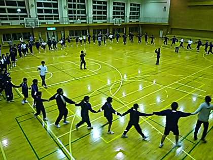夕食後は体育館で4校そろって学級紹介を行いました。合唱を披露したり、全員でダンスをしたりして、交流を深めました。