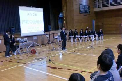 小6訪問では中学生が中学校生活につて説明したり、部活動体験をしたりして芦花中学校の雰囲気を伝えました。